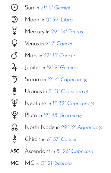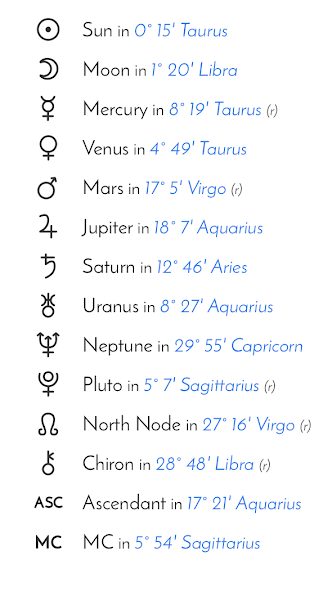 Like this individual’s mock chart, your chart may have an “R” next to a planet, indicating that said planet is in a natal retrograde in the chart. Likewise, it’s also totally possible to not have any natal retrogrades! However, it’s always worth checking out because it can prelude to how one’s life may be impacted in very specific ways (more ahead, I promise).