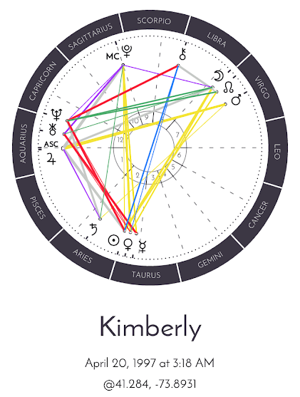 Our second Random Reading is a Taurus Sun, Libra Moon named Kimberly! Kimberly was born on 04/20/1997 at 03:18 AM at Cortlandt Manor, NY, USA. Due to some difficulties with locating Cortlandt Manor, the longitude and latitude was used instead. Check out Kimberly’s chart below!