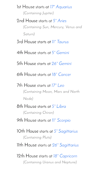 Kimberly also has a both a highest and lowest degree in her planets. With Sun in Taurus at 0 degrees, this indicates a new cycle, a new pattern, a new life. This is an auspicious low degree! With Neptune in Capricorn at 29 degrees, this indicates the end of a cycle. Neptune in Cap at the Anarectic degree indicates the fear of a failed dream/goal, being “out to lunch” or having the “rose colored glasses on”, and/or either being too or not enough realistic. This is an aspect that creates a nervous “I-need-to-hurry” energy because this is the end of an old cycle. Don’t stress. You’re right where YOU need to be – wherever that may be.