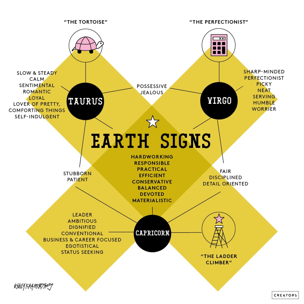 “Easy does it” is the Earth sign mentality. Without a single doubt in my mind, this is the most stable group of all the elemental groups in the Zodiac. Unlike the turbulence of fire, air, and water, earth signs are steady. This is the group of signs you rely on when the going gets tough.